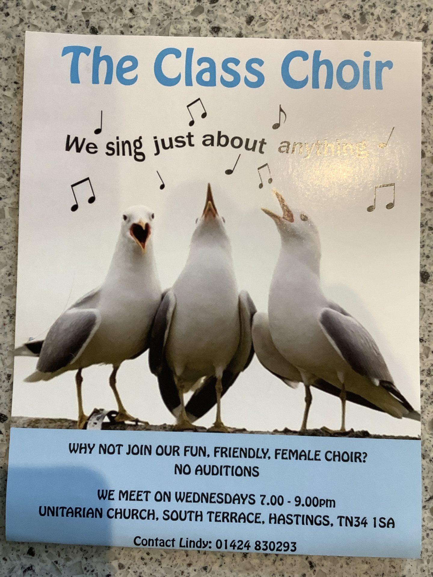 We are a friendly, all female choir based in Hastings Town Centre. We meet on Wednesday evenings 7-9pm in The Unitarian Church, term times only.