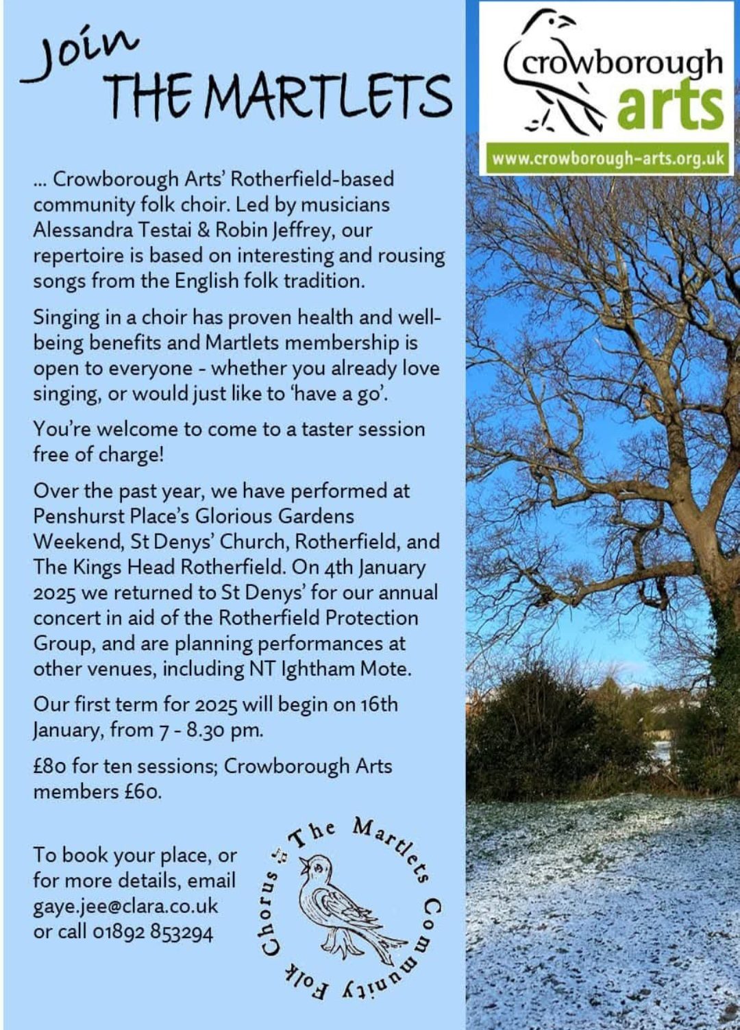 Led by experienced musicians Alessandra Testai and Robin Jeffrey, with Gaye Jee of Crowborough Arts. We are a friendly bunch,an inclusive non audition choir learning beautiful arrangements by Robin Jeffrey of trad folk from Sussex and beyond, with some historical songs, with occasional performances at venues across Kent and Sussex.
