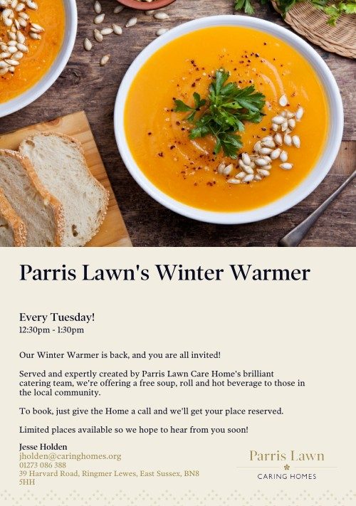 Served and expertly created by Parris Lawn Care Home's brilliant catering team, we're offering a free soup, roll and hot beverage to those in the local community.