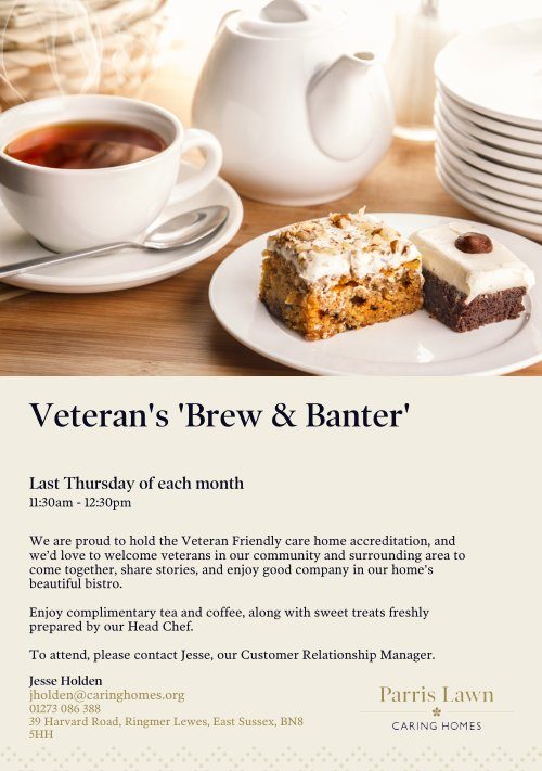 We are proud to hold the Veteran Friendly care home accreditation, and we’d love to welcome veterans in our community and surrounding area to come together, share stories, and enjoy good company in our home's beautiful bistro. Enjoy complimentary tea and coffee, along with sweet treats freshly prepared by our Head Chef. To attend, please contact Jesse, our Customer Relationship Manager, on 01273 086388.